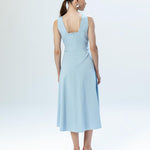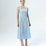 Göğüs hattındaki net ve düz kesim, bel bölgesindeki vücudu saran asimetrik korsaj paneliyle birleşerek elbiseye heykelsi ve modern bir form kazandırıyor. Korsajdan aşağı doğru süzülen ince şerit detaylar minimal yapıya hareket ve zarafet katarken, geniş omuz askıları ve akıcı vücut kesimi feminen hatları öne çıkarıyor. Akıcı kumaş yapısı her adımda rahat ve şık bir duruş sağlarken, özel davetler, kokteyller ve şık akşam yemekleri için sofistike bir seçim sunuyor.