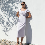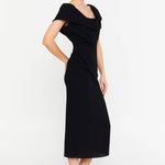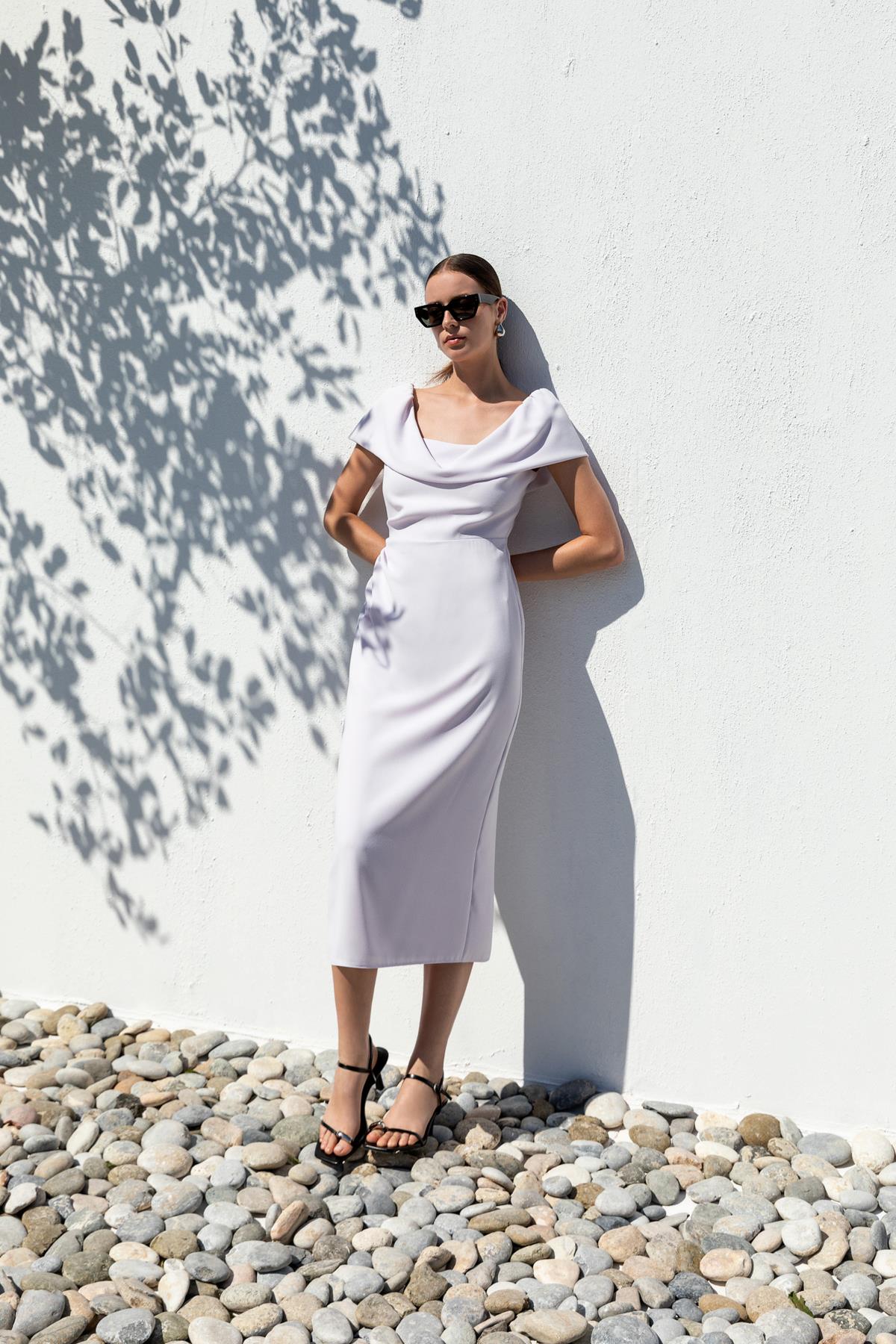 Zarafeti ve modern detayları bir araya getiren bu elbise, stil sahibi kadınların gözdesi olmaya aday. Degaje yaka tasarımı, şıklığı vurgularken, özenle yerleştirilmiş yırtmaç detayları hareket özgürlüğü ve cesur bir dokunuş sunuyor. İnce kesimi sayesinde vücudu nazikçe saran elbise, akıcı kumaşıyla gün boyu konfor sağlıyor. İster özel davetlerde ister akşam yemeği gibi şık ortamlarda rahatlıkla tercih edilebilecek bu parça, modern ve sofistike bir görünüm arayanlar için ideal. Gardırobunuzda mutlaka yer alması gereken bu elbise, şıklığınızı ve zarafetinizi ön plana çıkaracak.