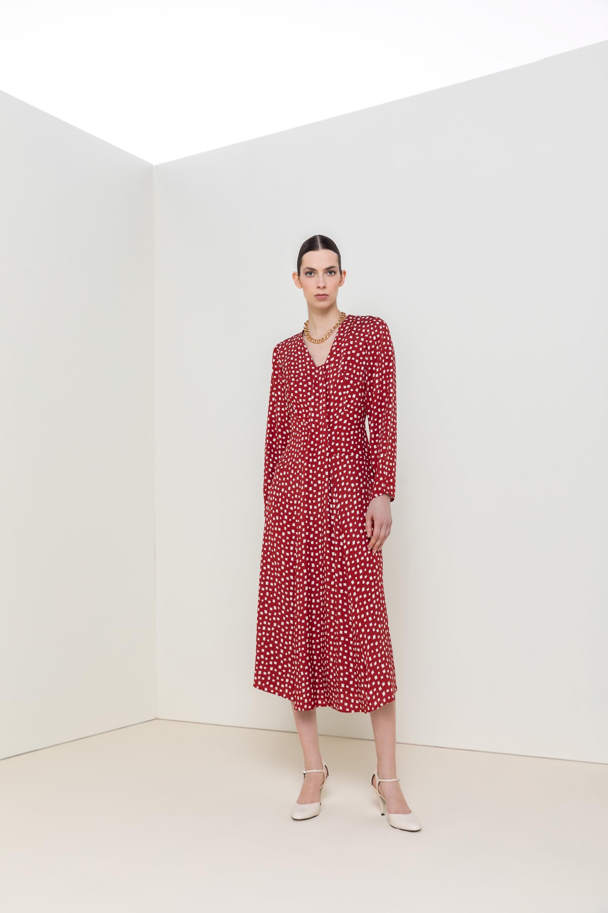 Zamansız silüeti ve modern deseniyle öne çıkan midi elbise, Kameya kadınının güçlü ve zarif duruşunu yansıtır. V yaka kesimi üst bedende feminen bir denge sağlarken, bel hattında hafif oturan formu vücudu nazikçe sarar. Akıcı etek yapısı hareket özgürlüğü sunar ve elbiseye doğal bir şıklık kazandırır. Geometrik desenleriyle klasik çizgiyi güncel bir yorumla buluşturan bu tasarım, hem gündüz hem akşam kombinlerine rahatlıkla uyum sağlar. Tek parça şıklık arayanlar için ideal bir alternatiftir.