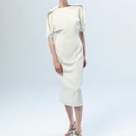 KATMANLI OMUZ DETAYLI MİDİ ELBİSE