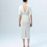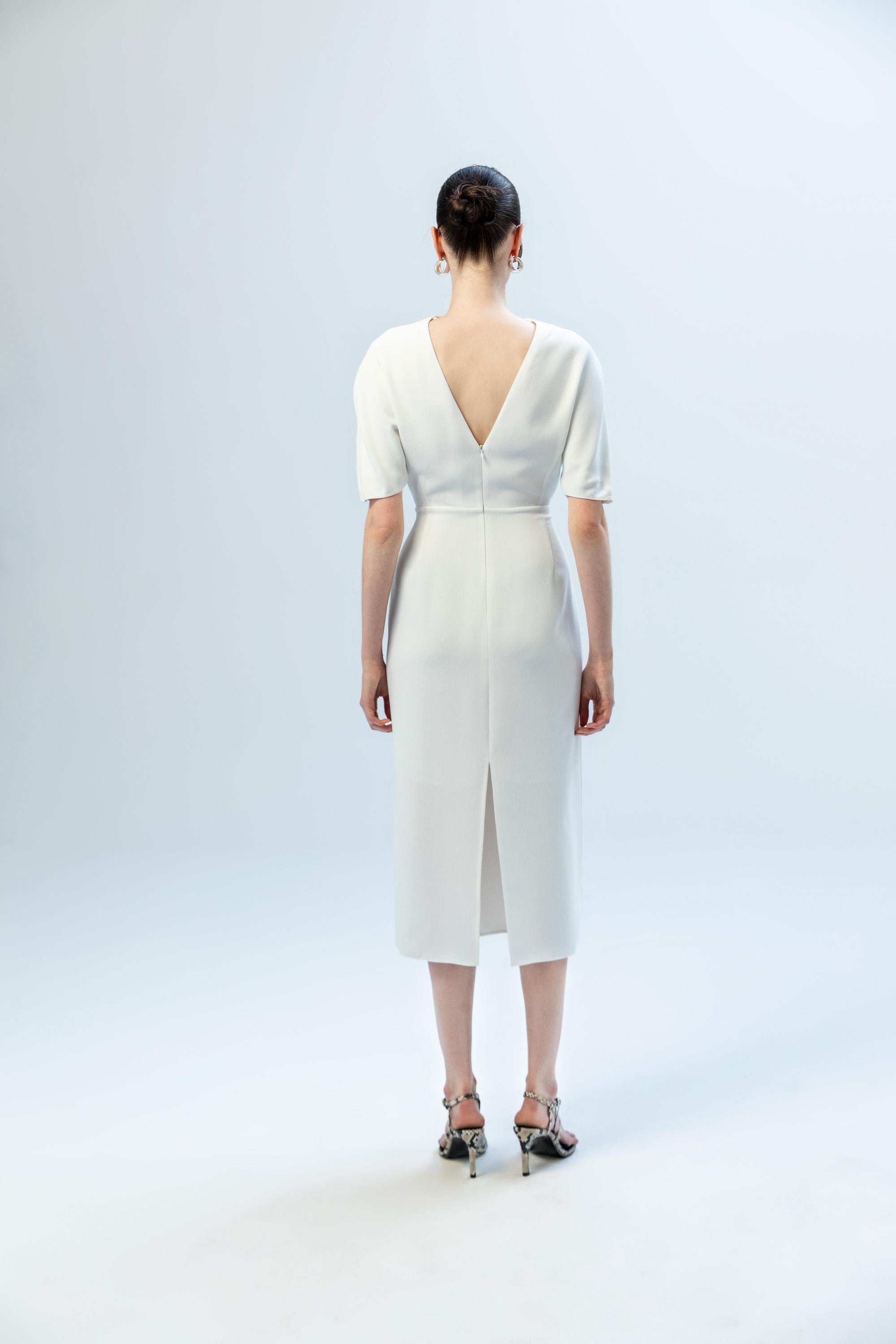 Ön yüzündeki yüksek ve pürüzsüz yaka hattı, omuzlardan aşağı doğru inen katman detayıyla modern ve güçlü bir görünüm sunar. Sırt dekoltesi tasarıma feminen bir denge katarken, yırtmaç detayı hem konfor hem de zarif bir hareket sağlar. Vücudu net çizgilerle saran midi boy kesimiyle davetlerden özel akşam yemeklerine kadar farklı ortamlarda rahatlıkla tercih edilebilir. Minimal takılar ve ince bantlı sandaletlerle tamamlayarak sade ama etkili bir stil oluşturabilirsiniz.