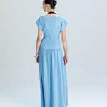 Kontrast yaka detayıyla modern bir vurgu kazanan maxi elbise, üst bölümdeki çapraz formu ve yüksek belden oturan kesimiyle dengeli bir siluet sunar. Akışkan eteği hareketli ve zarif bir görünüm sağlarken, gün boyu konforlu bir kullanım sunar. Şehir stilinden özel davetlere kadar farklı kombinlere uyum sağlar.