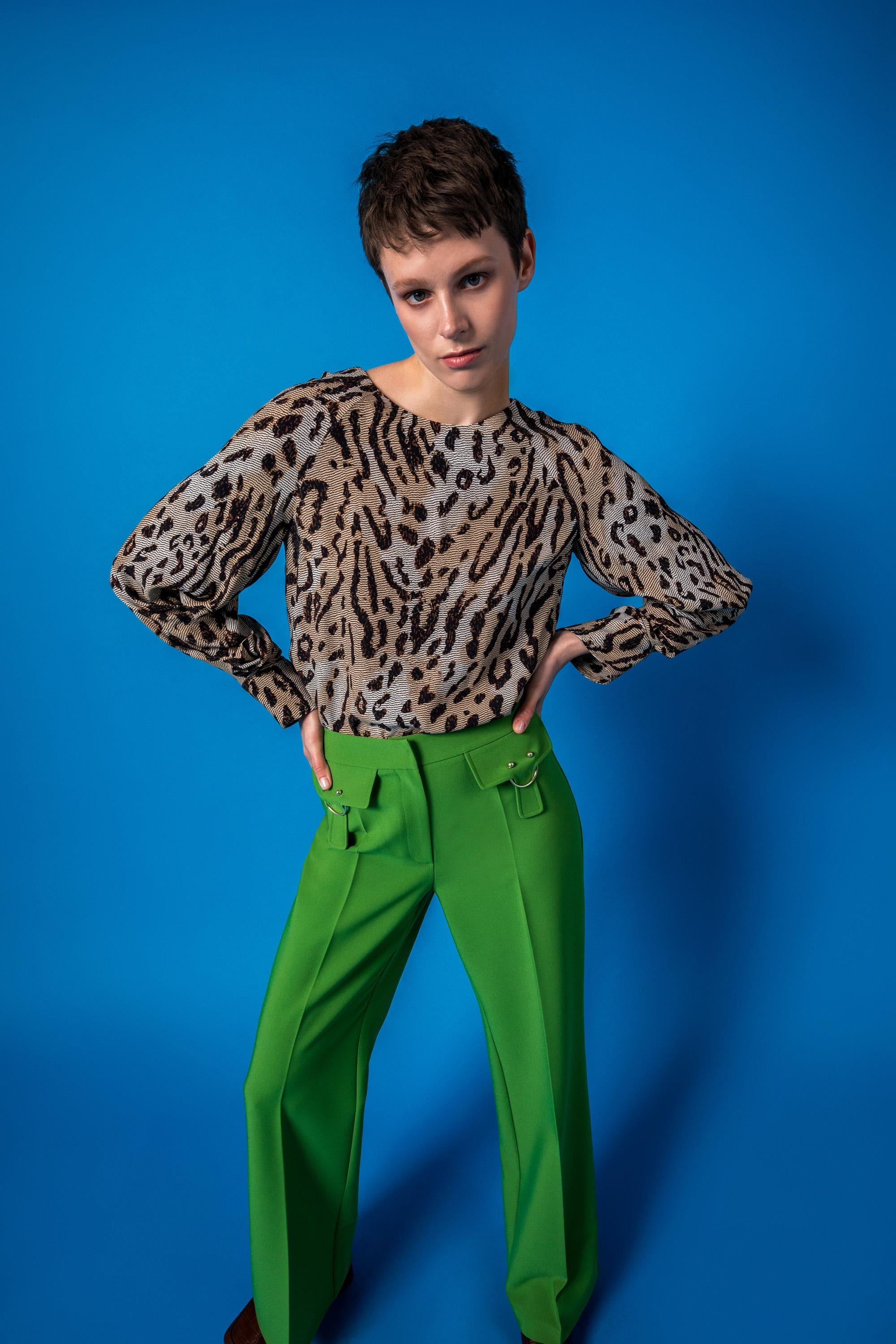 Kameya'nın modern ve şık tasarımı olan metal aksesuarli bol paça pantolon ile rahatlığı ve şıklığı bir arada yaşayın. Bol paça kesimi, hareket özgürlüğü sunarken, metal aksesuar detayları pantolonunuza zarif bir dokunuş katar. Yüksek kaliteli kumaşı sayesinde hem günlük kullanımda hem de özel davetlerde tercih edebileceğiniz bu pantolon, stilinizi ön plana çıkarır.