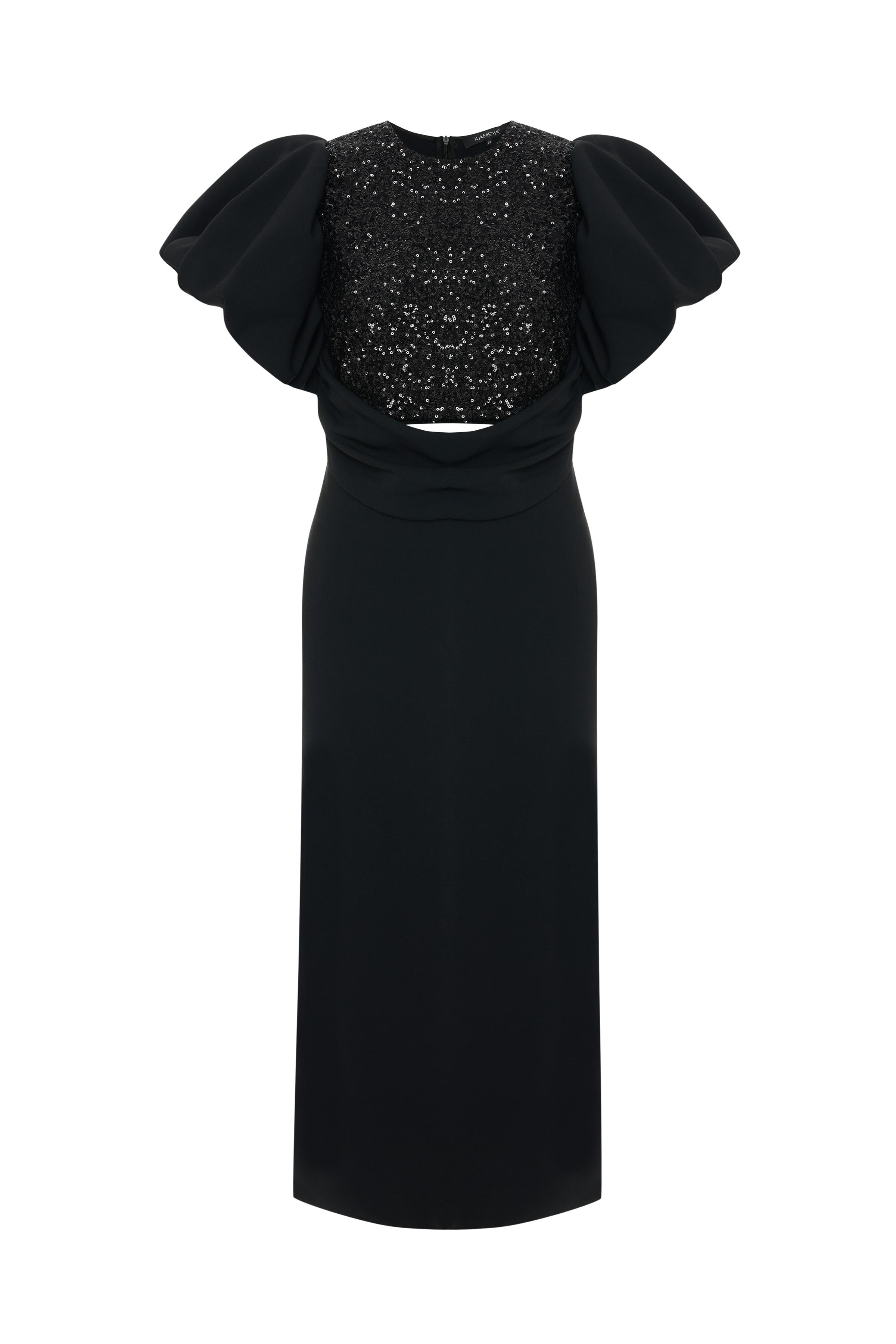 The sequin-detailed balloon sleeve dress stands out with its dazzling design, offering a modern and feminine look. With its elegant balloon sleeve design and sparkling sequin embellishments, this dress will highlight your style at special events and evening occasions. It will become one of the star pieces in your wardrobe.
