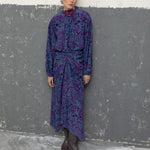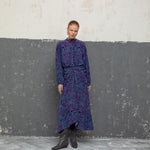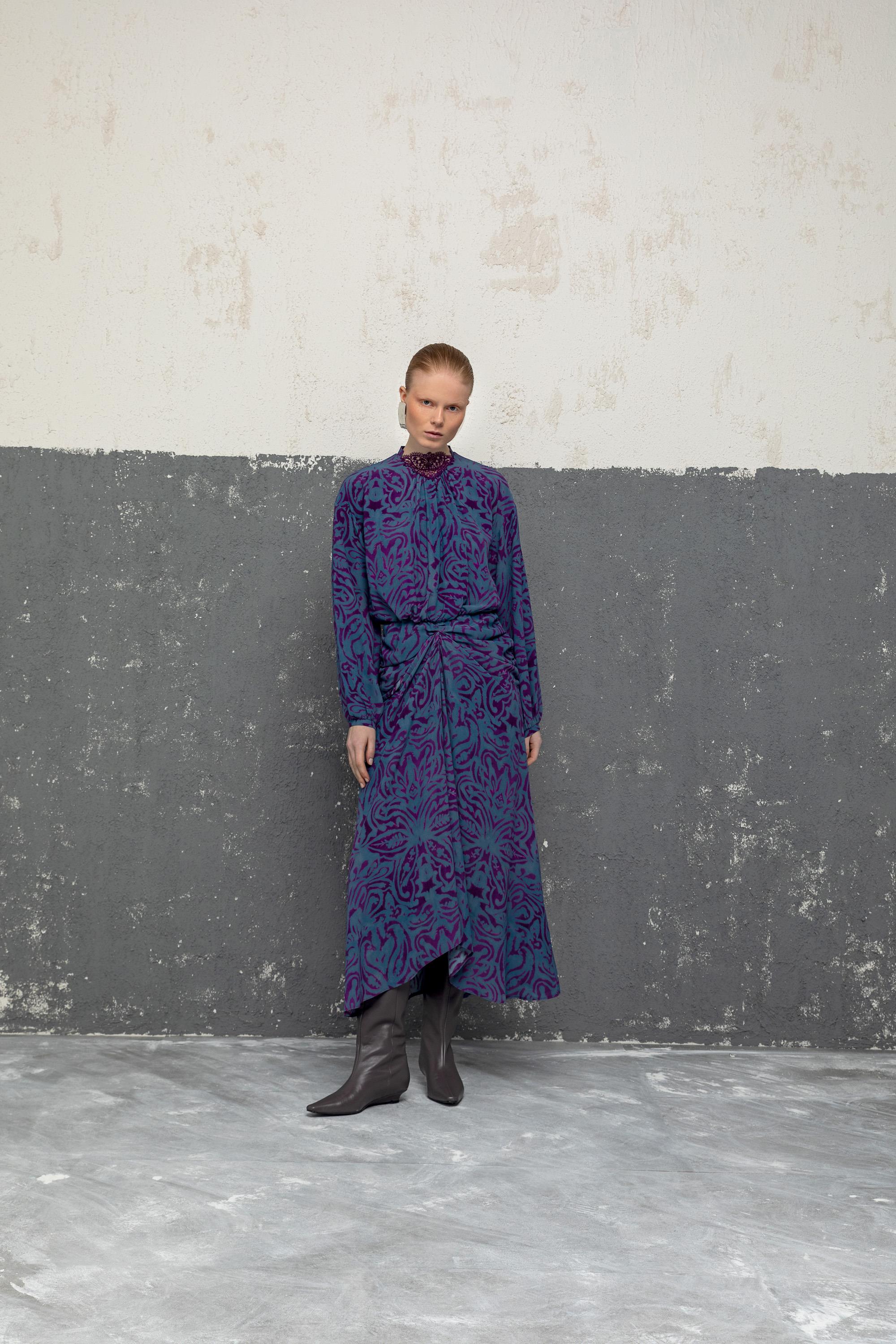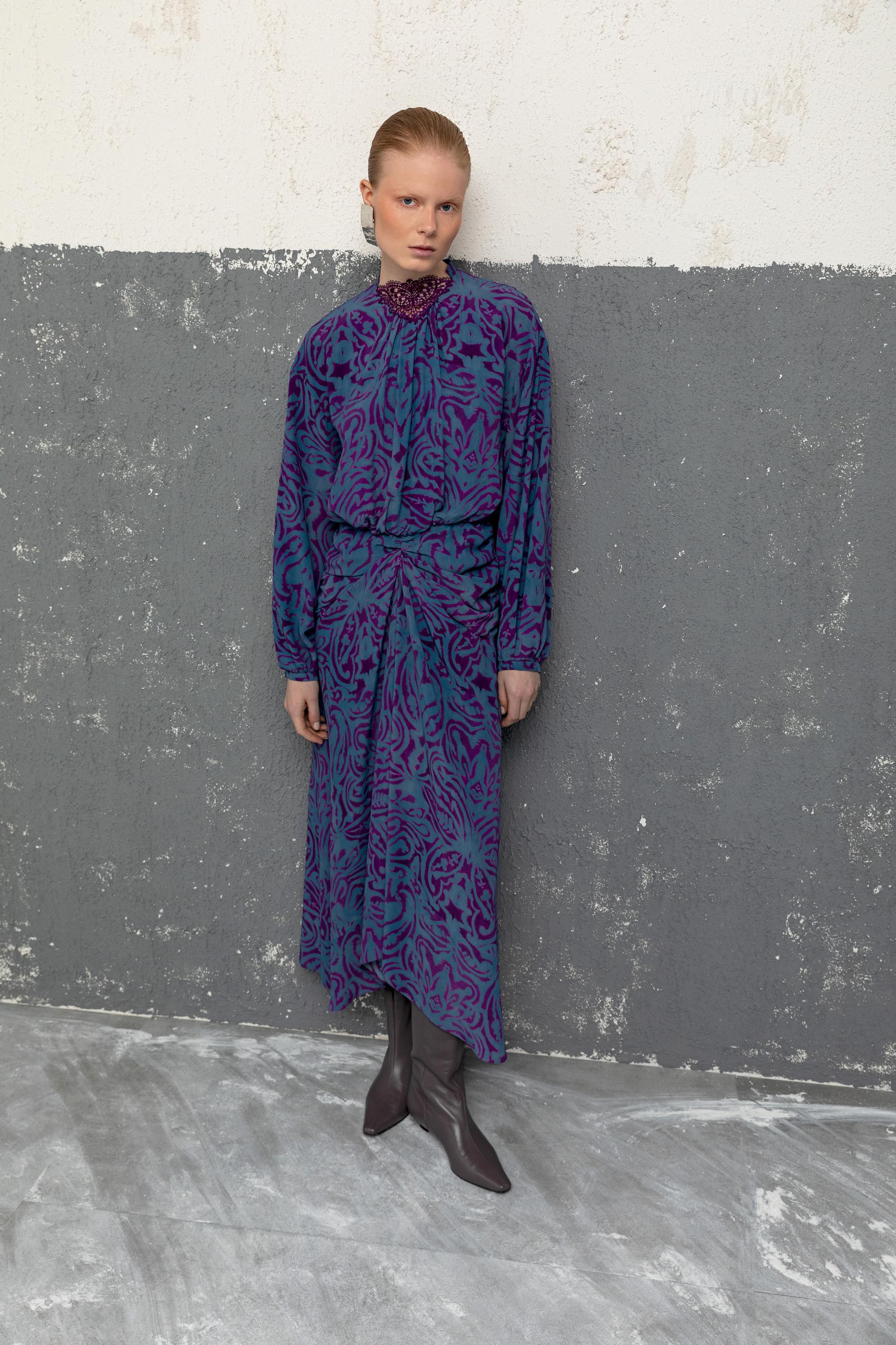 The belted draped patterned dress stands out with its feminine and modern design, creating an elegant silhouette with the draped detail at the waist. Its vibrant patterns offer an energetic look, making this dress perfect for both daily chic and special events, highlighting your style.