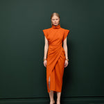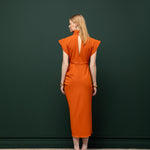 Modern ve zarif çizgisiyle öne çıkan volanlı midi elbise, enerjik rengiyle sofistike bir duruş sergiler. Yüksek yaka detayı ve vücudu saran kesimiyle feminen bir silüet oluşturur. Yapılandırılmış omuz formu ve kusursuz dikişleriyle özel davetlerde dikkat çekici bir görünüm sunar.