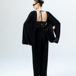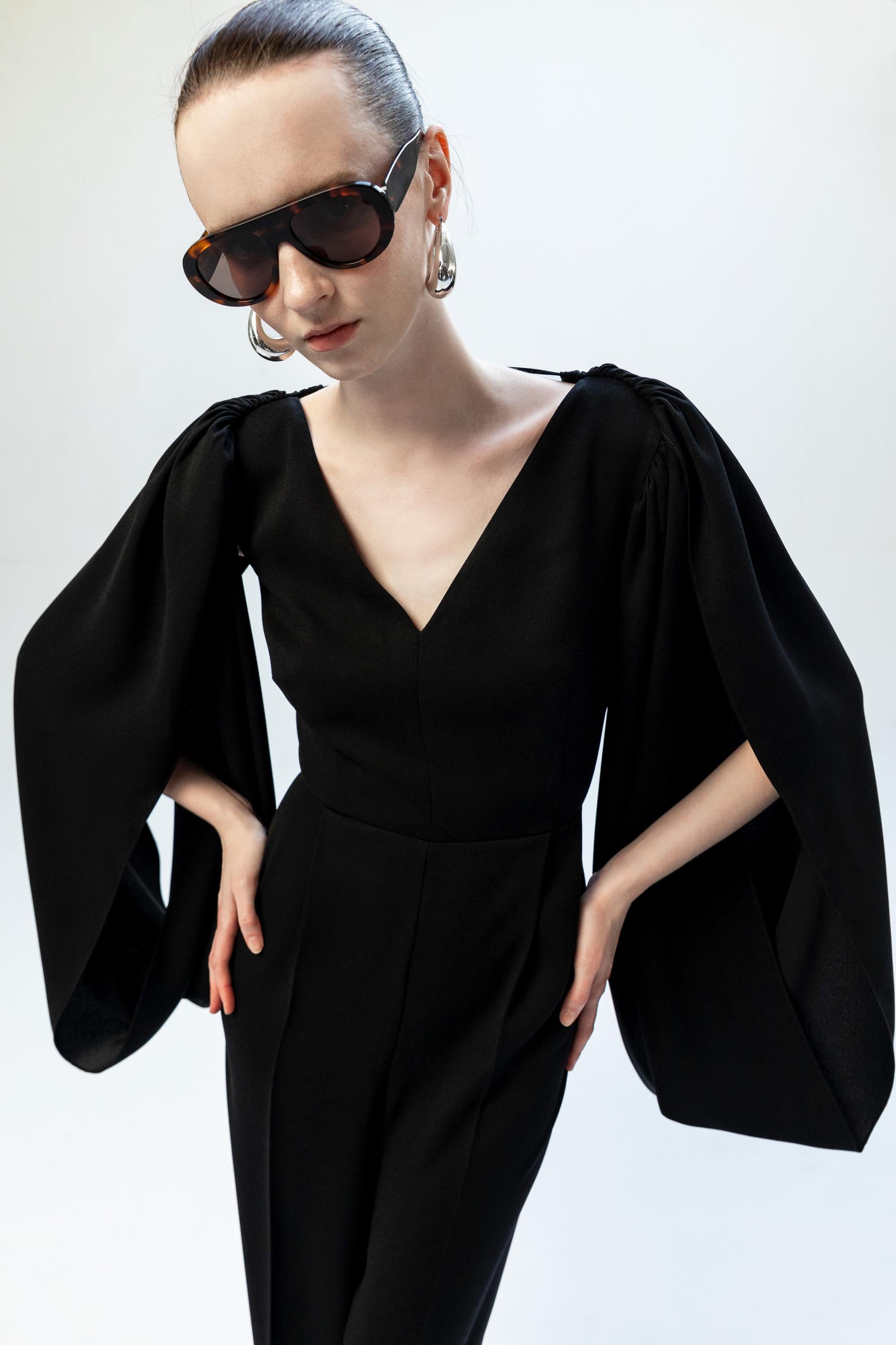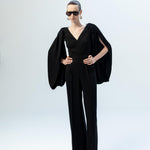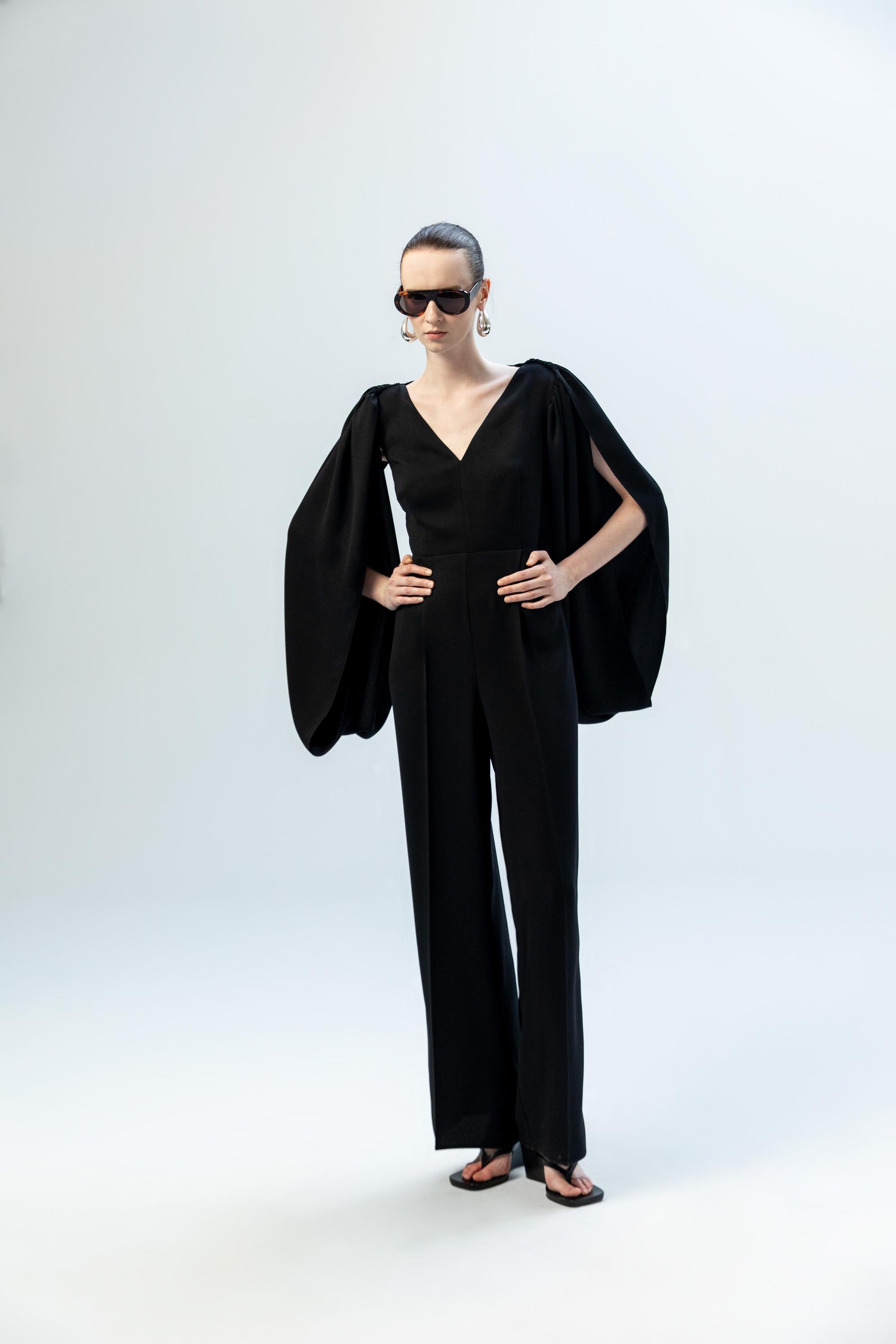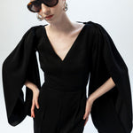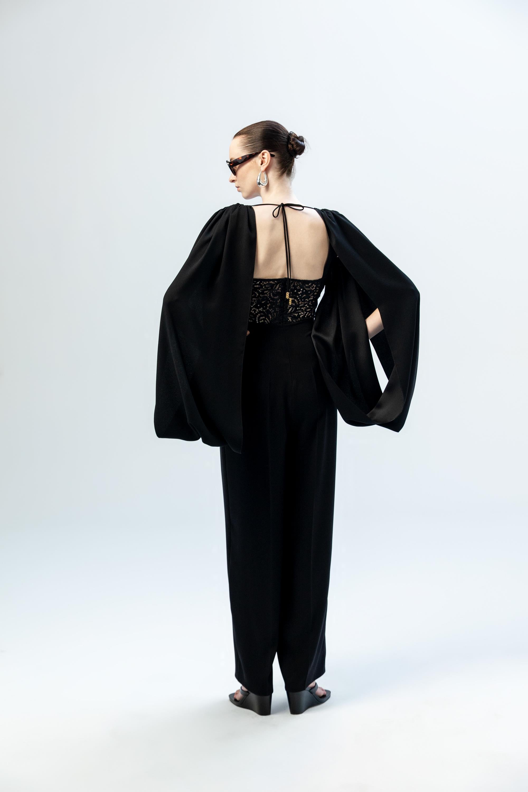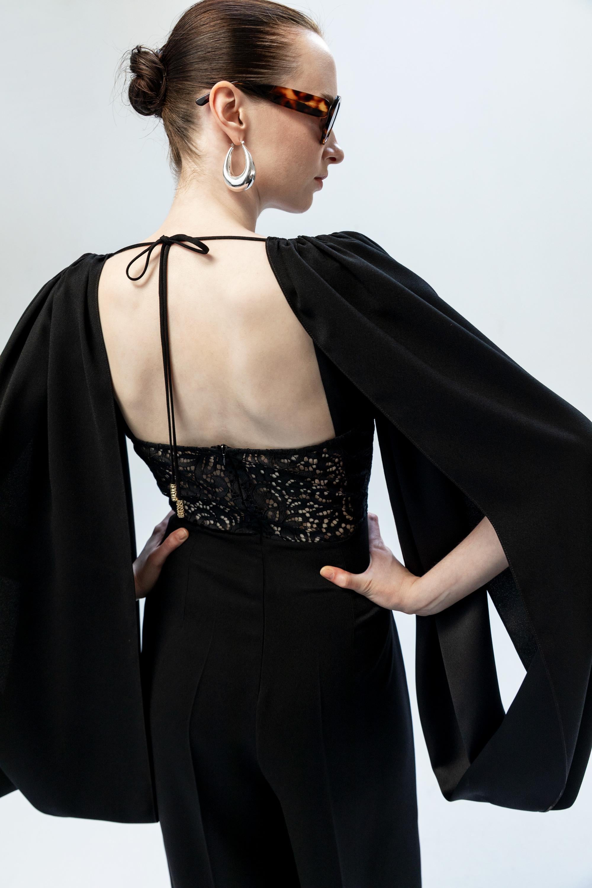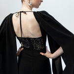 Omuzlardan aşağıya akışkan bir formda süzülen derin yırtmaçlı pelerin kolları, tasarıma özgür ve dramatik bir hareket kazandırır. Sırt kısmındaki derin dekolte içinde yer alan zarif dantel panel ve ense hattında birleşen ince bağlama detayı, heykelsi ve etkileyici bir arka görünüm sunar. Ön bölümdeki net V yaka kesimi ve vücuda oturan üst formu ile dengelenen bu elbise, modern ve asil bir davet şıklığı yaratır.