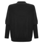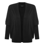 This black knit cardigan, featuring minimal lines, combines comfort with elegance with its soft texture and relaxed fit. Its wide shoulders and flowing shape create a modern silhouette, while simple details add a sophisticated touch. It's easy to wear with everyday urban outfits and office outfits.