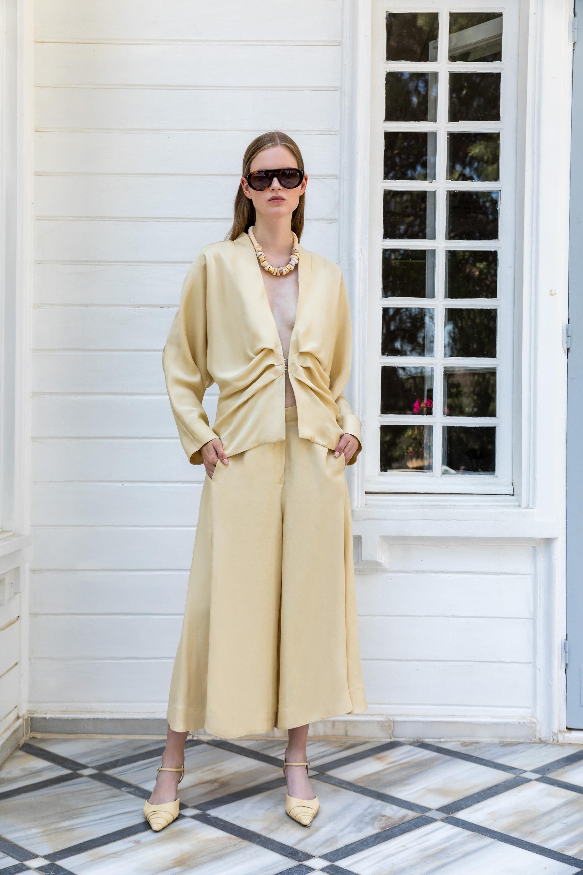 This jacket, which combines the naturalness of linen with a modern form, adds a fresh and distinguished touch to your style. The gathered drape detail at the waist adds movement to the design, while the deep V-neck cut offers simple elegance. With its wide sleeve structure and flowing form, it is designed to make you feel both comfortable and sophisticated on summer days. You can wear it as a set for a tone-on-tone look; complete your style with gold chain necklaces and high heels.