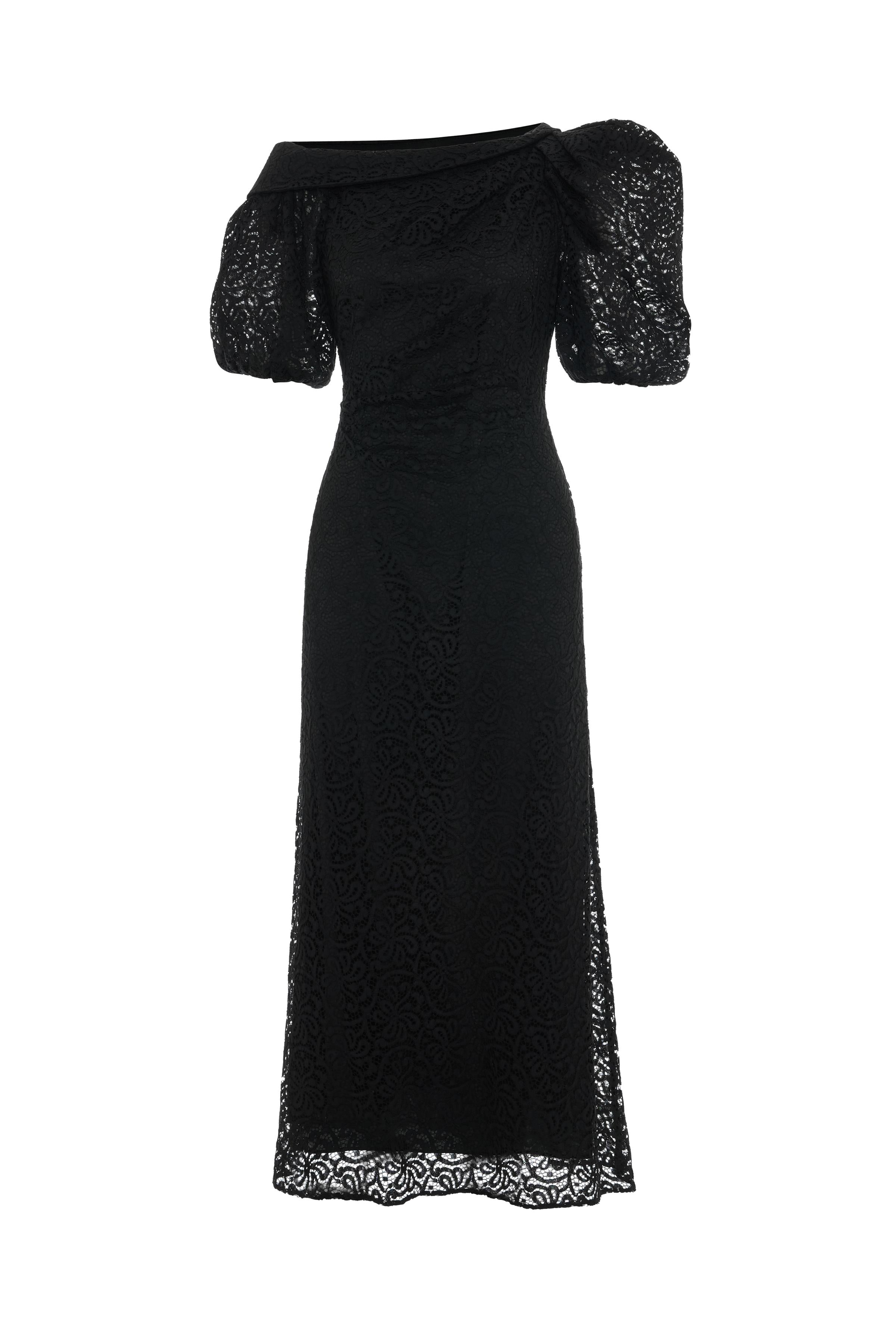 It offers a feminine yet strong silhouette with its delicately accentuated shoulder line, dropped shoulder form, and voluminous balloon sleeve detail. The fine lace texture spread across the entire surface adds depth and a romantic character to the design, while the gently embracing upper form and the midi-length cut that gracefully widens towards the hem create a balanced proportion. The clean lines continuing on the back panel and the supportive structure give the dress a modern architectural stance. The dress's texture can be highlighted by pairing it with minimal sandals and simple gold-toned accessories. It offers a natural yet sophisticated look from sunset parties to summer evenings.