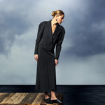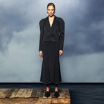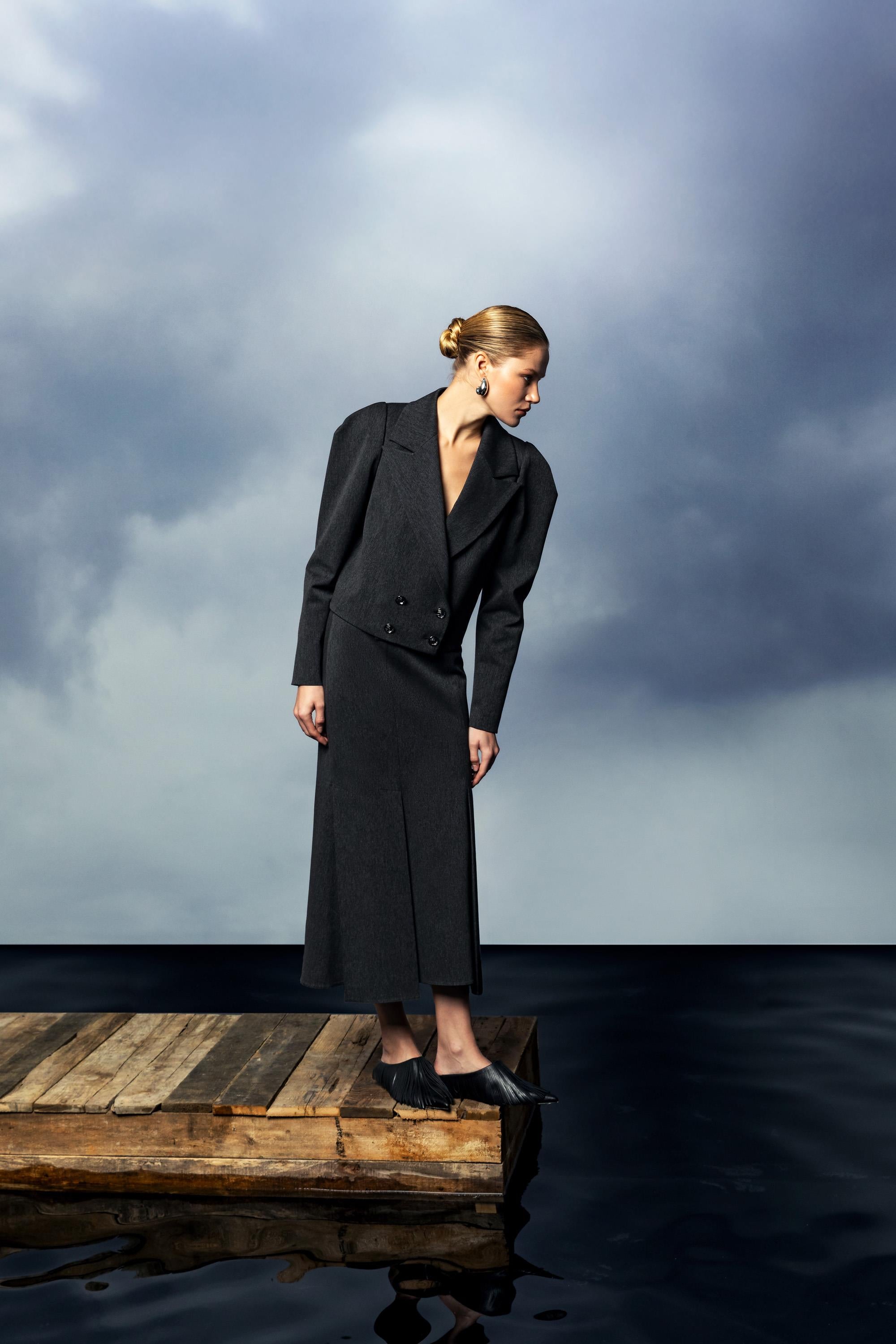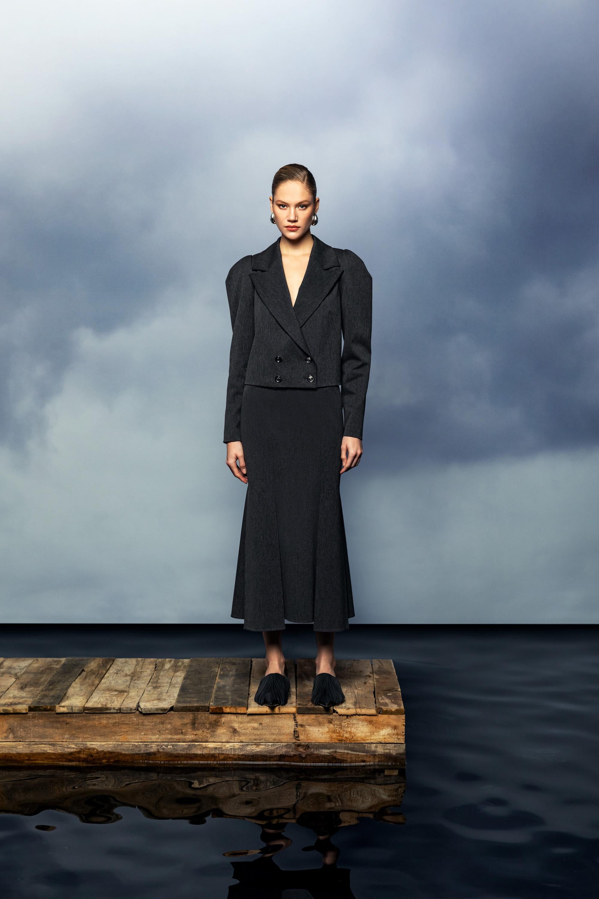 This double-breasted jacket, with its powerful silhouette and elegant lines, adds a sophisticated interpretation to Kameya's modern urban style. Its short form and sharp shoulder line give it a sculptural presence, while fine stitching details balance the elegance. Its texture, which provides all-day comfort, creates a timeless look that can be worn both as a suit and as a single piece.