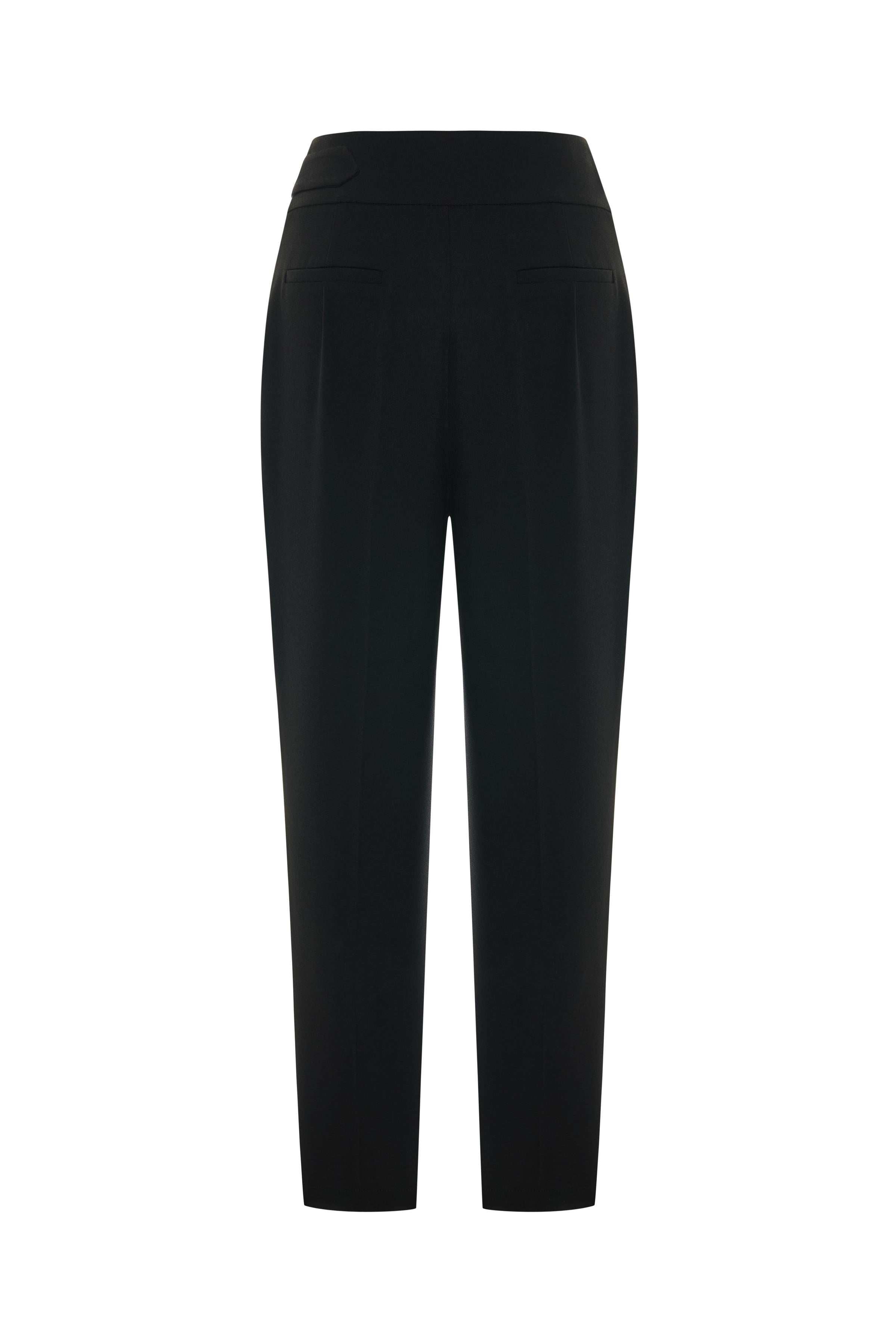 The high-waisted belt shape and the symmetrical gold-toned metal buckles add a strong and eye-catching emphasis to the design. The carrot-cut silhouette, tapering slightly from the waist down, offers a modern and balanced look. The subtle pleat details and sharp crease detail on the front panel blend masculine tailoring with feminine elegance. Side pockets provide comfort for everyday wear while maintaining the clean lines of the design. When combined with tops in similar tones, a monochrome and powerful look is achieved.