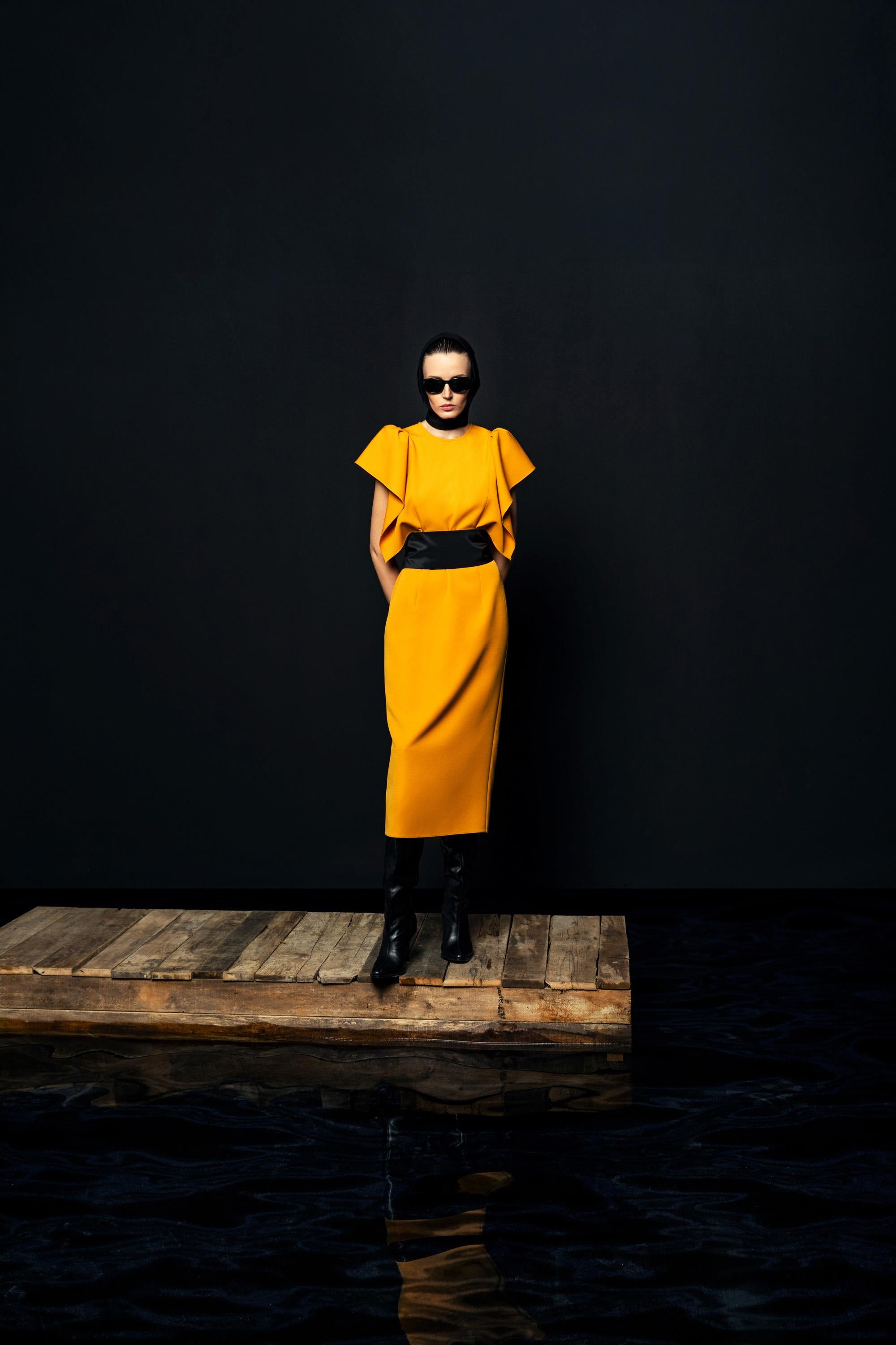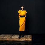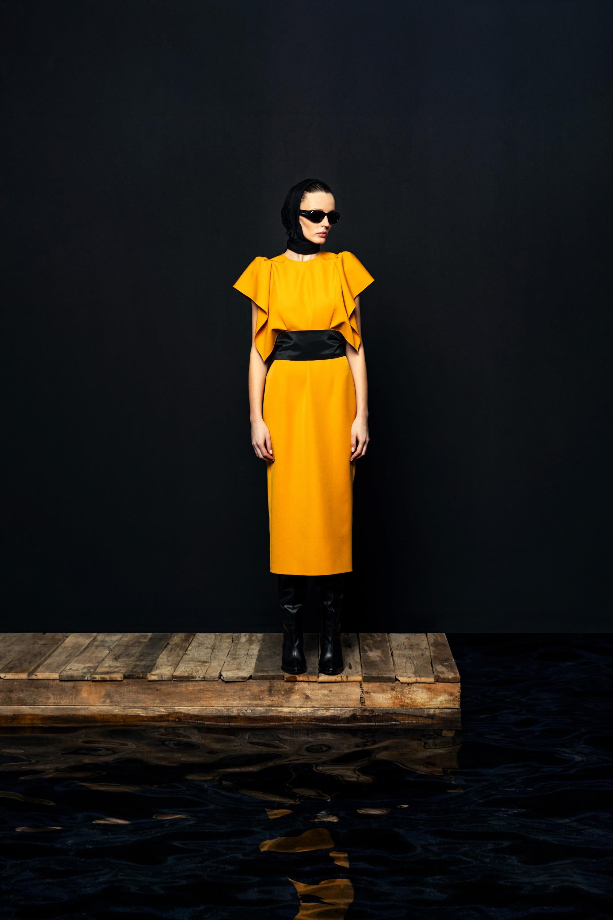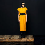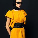 This striking midi dress, with its vibrant yellow hue and elegant ruffle sleeve detail, combines feminine elegance with a modern form. A contrasting black belt at the waist accentuates the figure's contours, creating a flawless silhouette. Its flowing fabric and flowing sleeves ensure all-day comfort. Achieve a formal chic with heels and an everyday elegance with flats.
